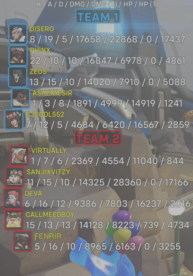 10 entries| Team | Player | Kills | Assists | Deaths | Damage | Damage (Taken) | Healing | Healing (Taken) |