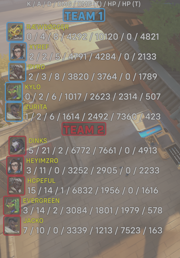 6 entries| Team | Player | Kills | Assists | Deaths | Damage | Damage (Taken) | Healing | Healing (Taken) |