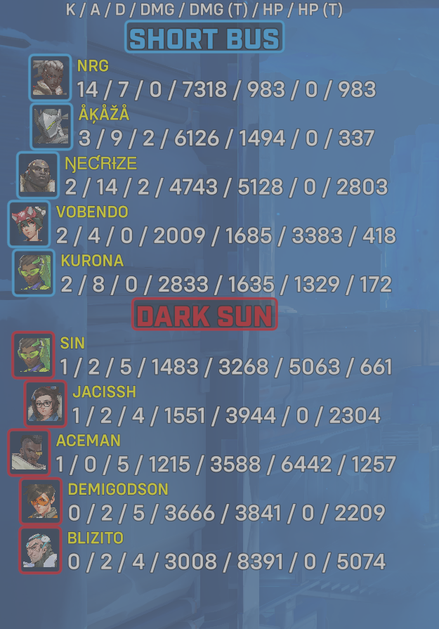 10 entries| Team | Player | Kills | Assists | Deaths | Damage | Damage (Taken) | Healing | Healing (Taken) |