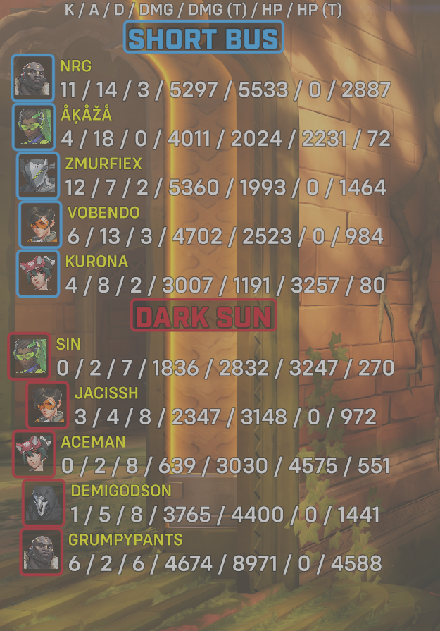 10 entries| Team | Player | Kills | Assists | Deaths | Damage | Damage (Taken) | Healing | Healing (Taken) |