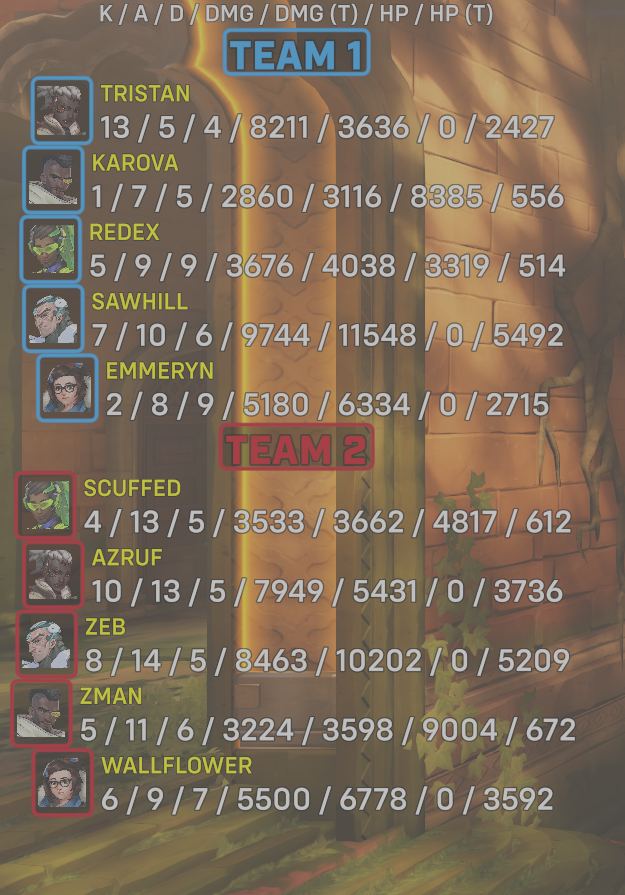 10 entries| Team | Player | Kills | Assists | Deaths | Damage | Damage (Taken) | Healing | Healing (Taken) |