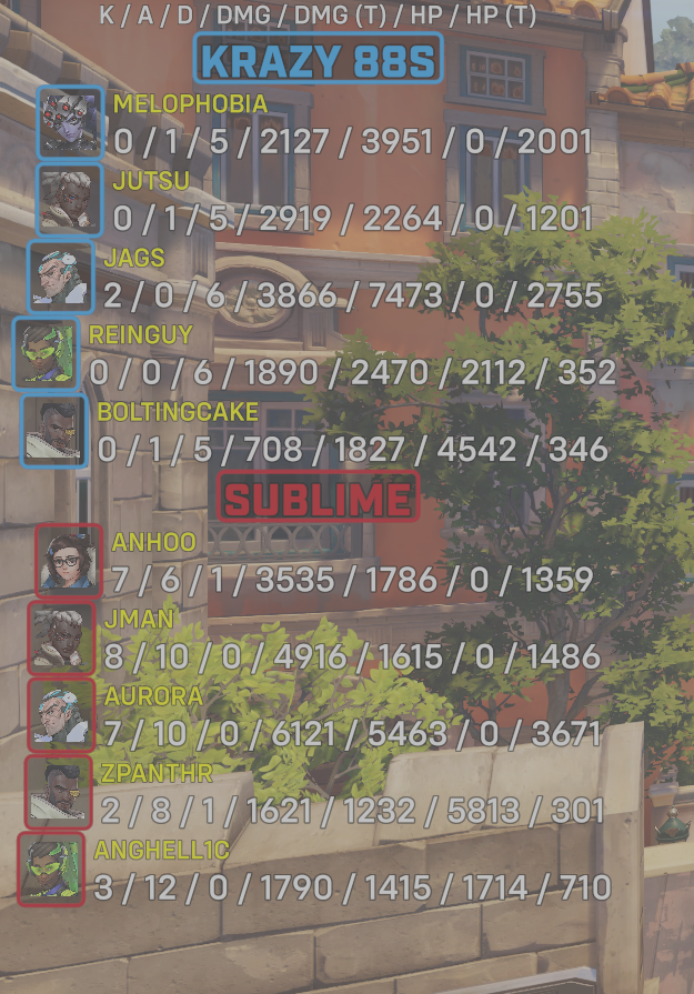 10 entries| Team | Player | Kills | Assists | Deaths | Damage | Damage (Taken) | Healing | Healing (Taken) |