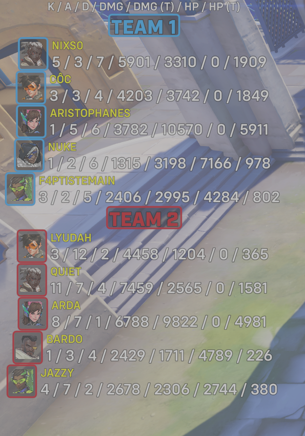 10 entries| Team | Player | Kills | Assists | Deaths | Damage | Damage (Taken) | Healing | Healing (Taken) |