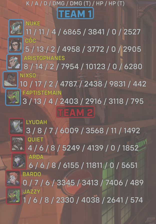 10 entries| Team | Player | Kills | Assists | Deaths | Damage | Damage (Taken) | Healing | Healing (Taken) |