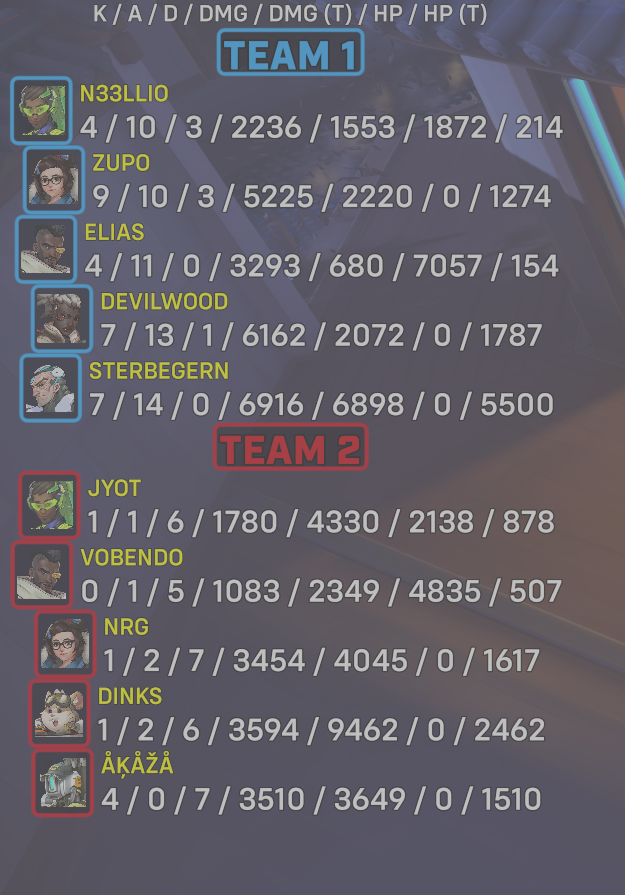 10 entries| Team | Player | Kills | Assists | Deaths | Damage | Damage (Taken) | Healing | Healing (Taken) |
