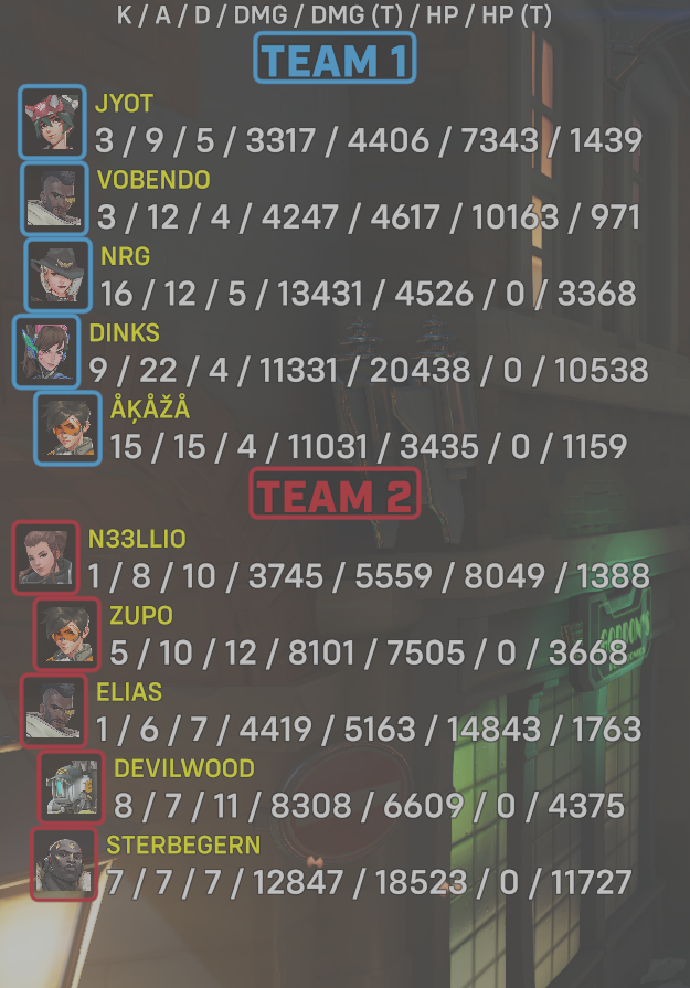 6 entries| Team | Player | Kills | Assists | Deaths | Damage | Damage (Taken) | Healing | Healing (Taken) |