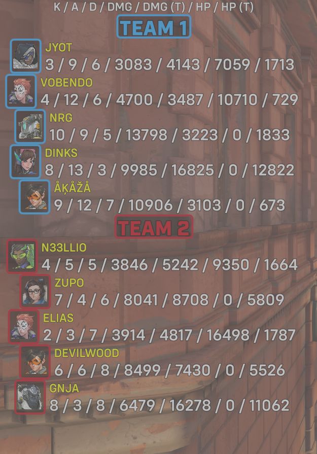 10 entries| Team | Player | Kills | Assists | Deaths | Damage | Damage (Taken) | Healing | Healing (Taken) |
