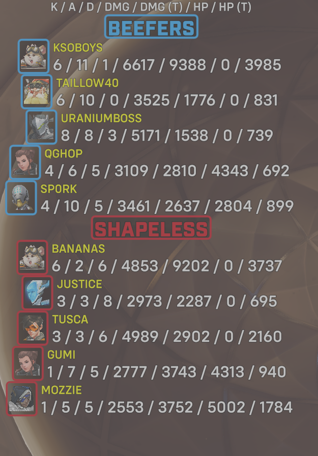 10 entries| Team | Player | Kills | Assists | Deaths | Damage | Damage (Taken) | Healing | Healing (Taken) |