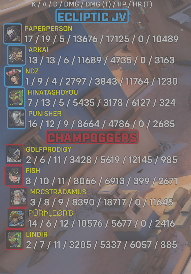 10 entries| Team | Player | Kills | Assists | Deaths | Damage | Damage (Taken) | Healing | Healing (Taken) |