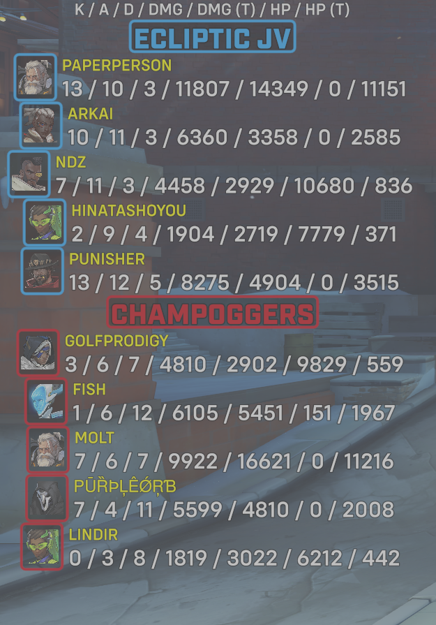 10 entries| Team | Player | Kills | Assists | Deaths | Damage | Damage (Taken) | Healing | Healing (Taken) |