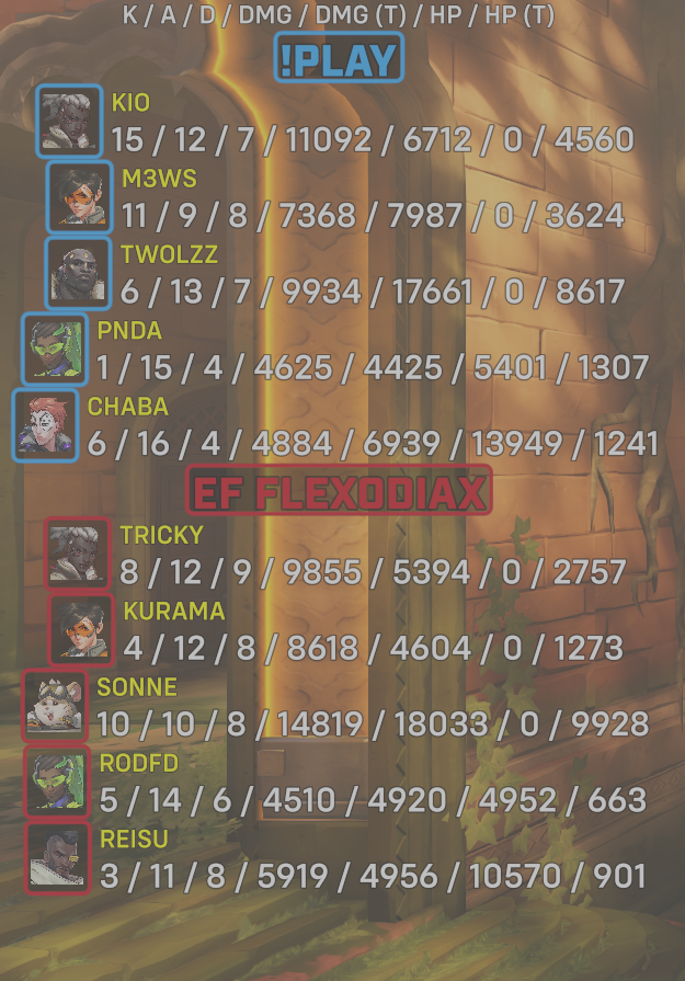 10 entries| Team | Player | Kills | Assists | Deaths | Damage | Damage (Taken) | Healing | Healing (Taken) |