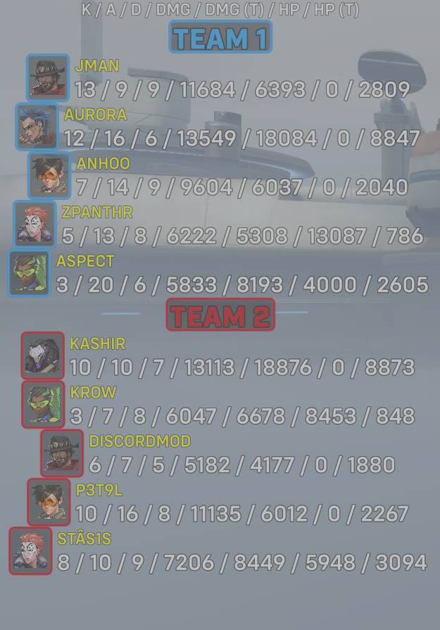 10 entries| Team | Player | Kills | Assists | Deaths | Damage | Damage (Taken) | Healing | Healing (Taken) |