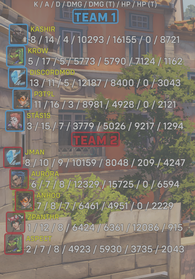 10 entries| Team | Player | Kills | Assists | Deaths | Damage | Damage (Taken) | Healing | Healing (Taken) |