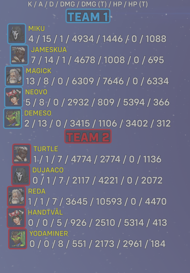 | Team | Player | Kills | Assists | Deaths | Damage | Damage (Taken) | Healing | Healing (Taken) |