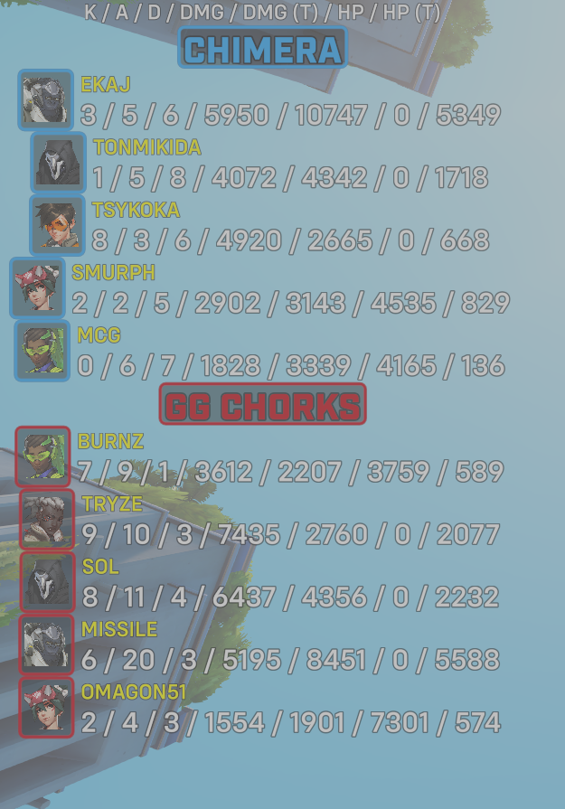 | Team | Player | Kills | Assists | Deaths | Damage | Damage (Taken) | Healing | Healing (Taken) |
