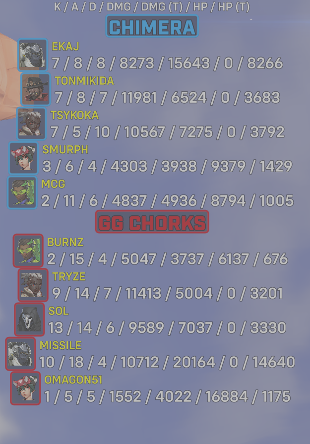 | Team | Player | Kills | Assists | Deaths | Damage | Damage (Taken) | Healing | Healing (Taken) |