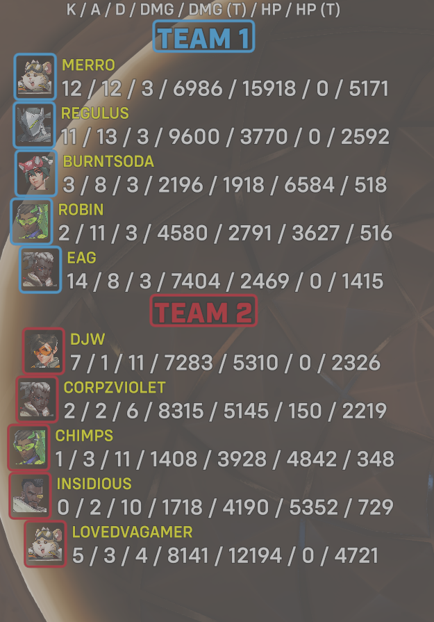 | Team | Player | Kills | Assists | Deaths | Damage | Damage (Taken) | Healing | Healing (Taken) |