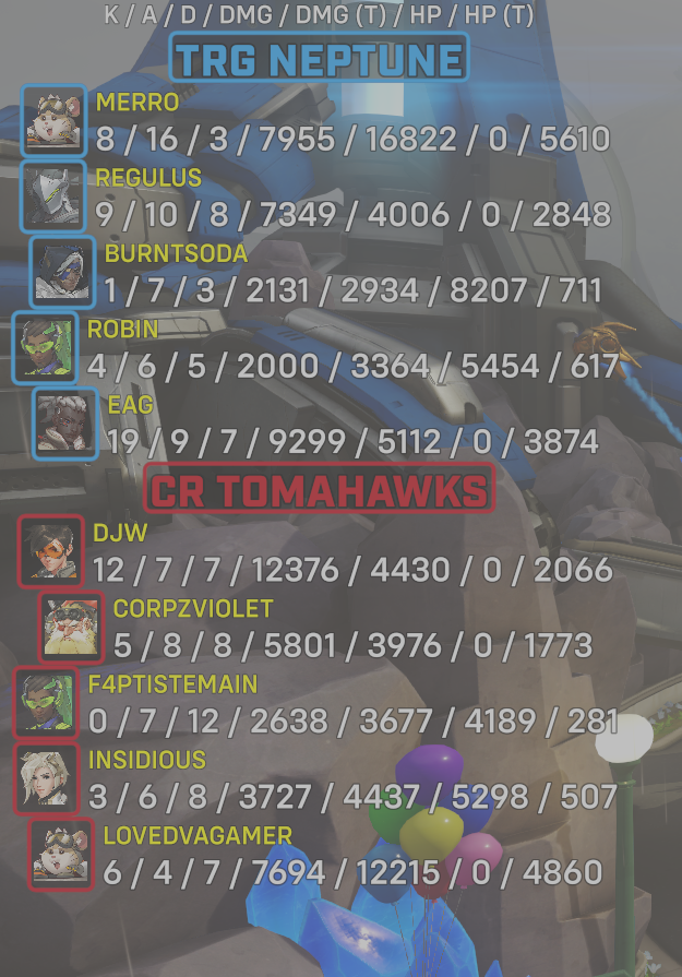 | CR Tomahawks | LoveDvaGamer#2261 | 6 | 4 | 7 | 7694 | 12215 | 0 | 4860 |