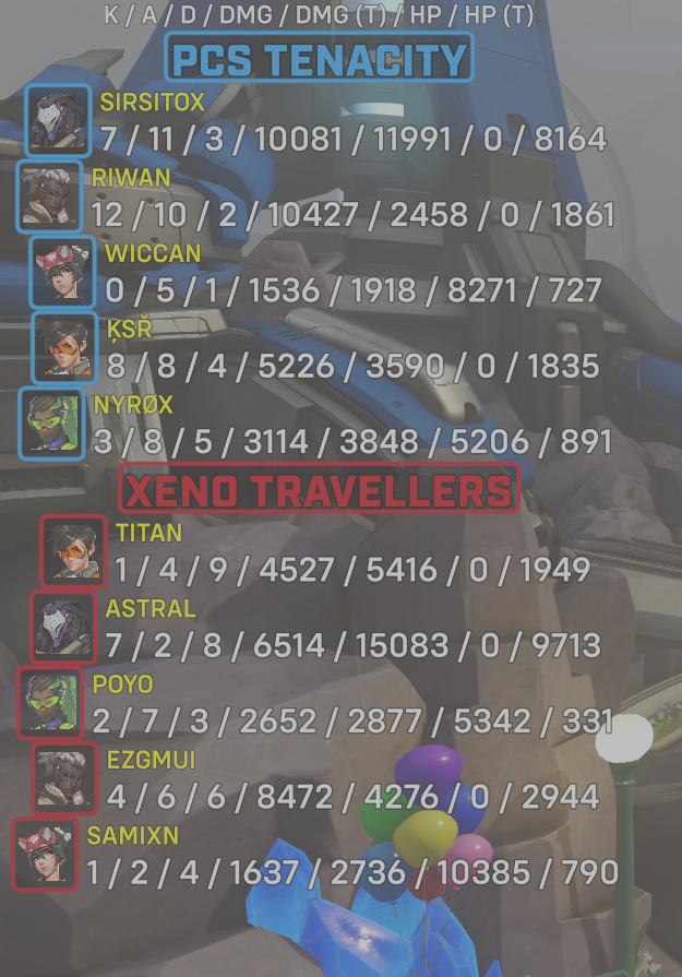 | Team | Player | Kills | Assists | Deaths | Damage | Damage (Taken) | Healing | Healing (Taken) |