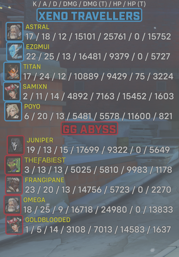 | Team | Player | Kills | Assists | Deaths | Damage | Damage (Taken) | Healing | Healing (Taken) |