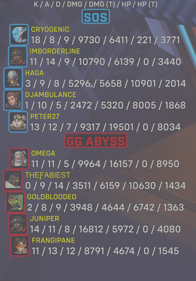 | Team | Player | Kills | Assists | Deaths | Damage | Damage (Taken) | Healing | Healing (Taken) |
