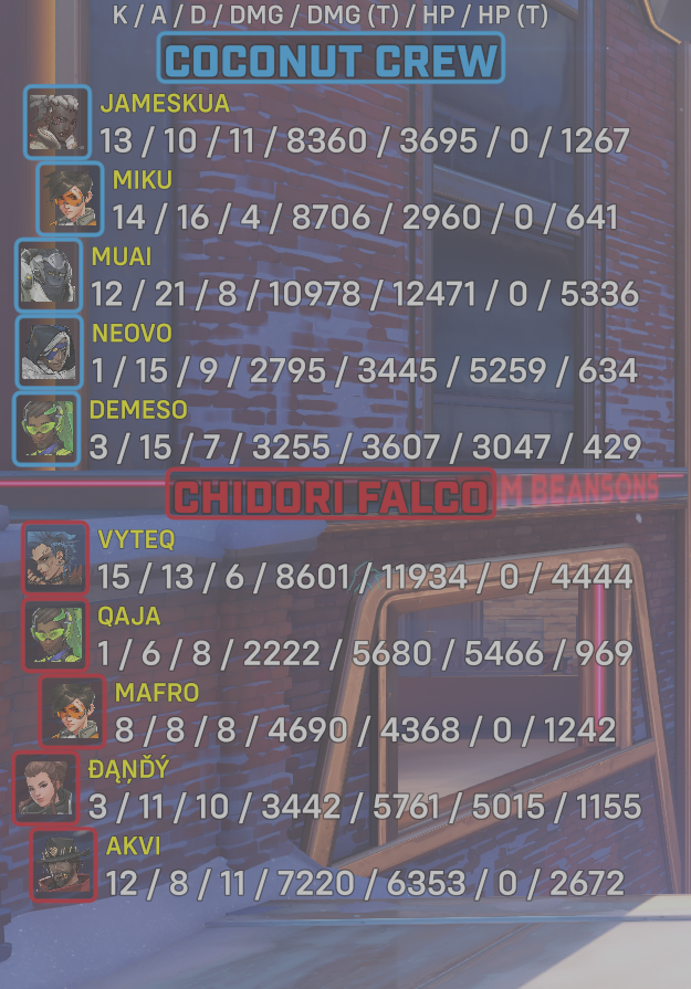 | Team | Player | Kills | Assists | Deaths | Damage | Damage (Taken) | Healing | Healing (Taken) |