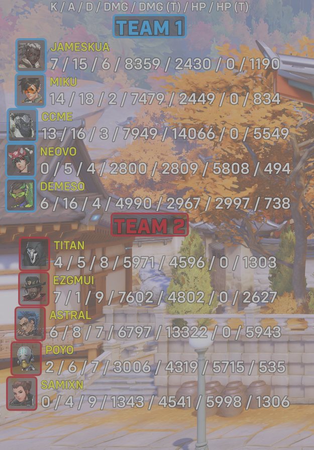 | Team | Player | Kills | Assists | Deaths | Damage | Damage (Taken) | Healing | Healing (Taken) |