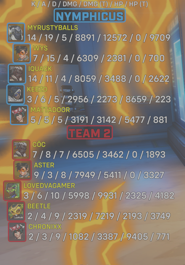 | Team | Player | Kills | Assists | Deaths | Damage | Damage (Taken) | Healing | Healing (Taken) |