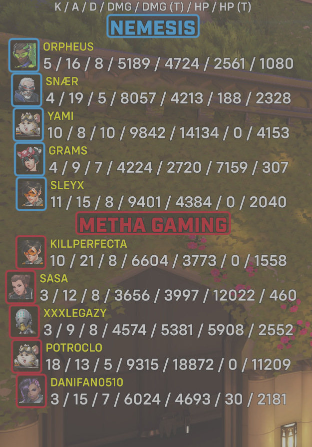 10 entries| Team | Player | Kills | Assists | Deaths | Damage | Damage (Taken) | Healing | Healing (Taken) |