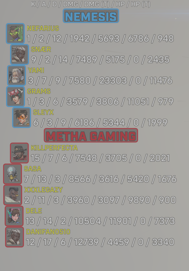 10 entries| Team | Player | Kills | Assists | Deaths | Damage | Damage (Taken) | Healing | Healing (Taken) |