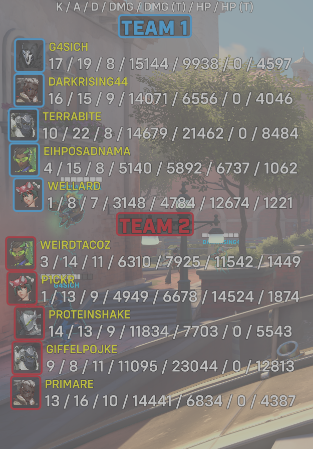 9 entries| Team | Player | Kills | Assists | Deaths | Damage | Damage (Taken) | Healing | Healing (Taken) |