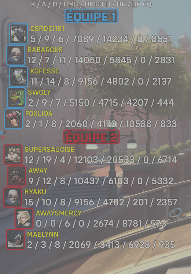 10 entries| Team | Player | Kills | Assists | Deaths | Damage | Damage (Taken) | Healing | Healing (Taken) |