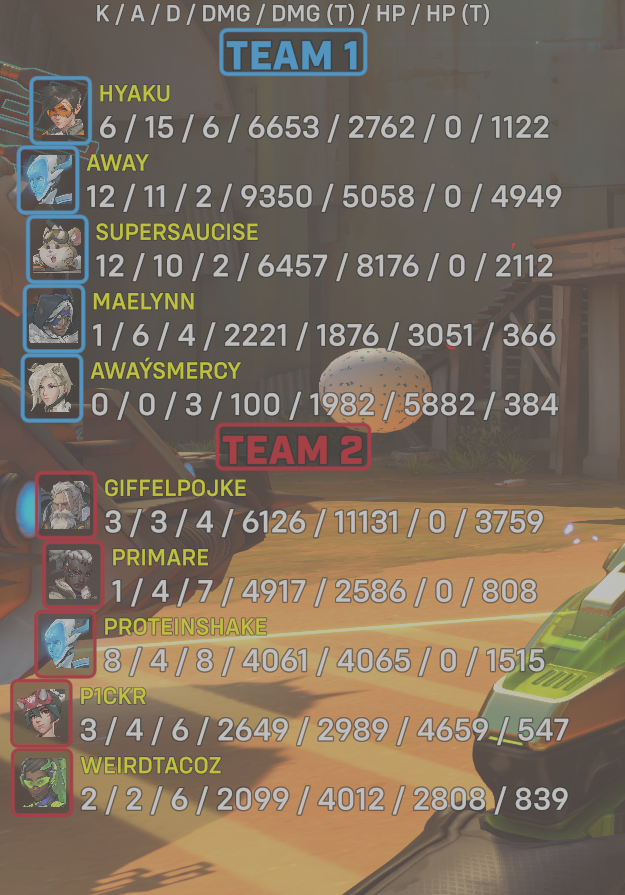 10 entries| Team | Player | Kills | Assists | Deaths | Damage | Damage (Taken) | Healing | Healing (Taken) |