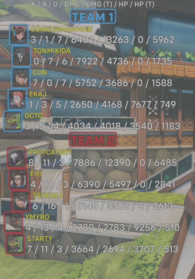 | Team | Player | Kills | Assists | Deaths | Damage | Damage (Taken) | Healing | Healing (Taken) |