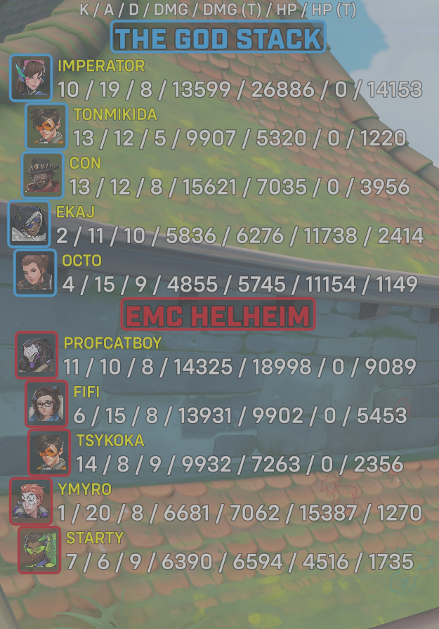 | Team | Player | Kills | Assists | Deaths | Damage | Damage (Taken) | Healing | Healing (Taken) |