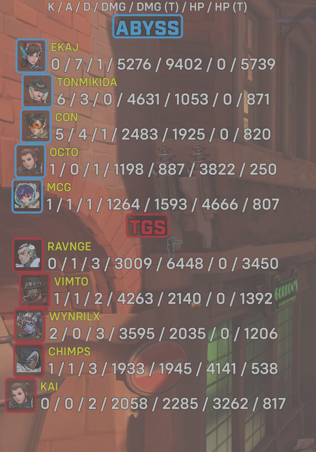 | Team | Player | Kills | Assists | Deaths | Damage | Damage (Taken) | Healing | Healing (Taken) |