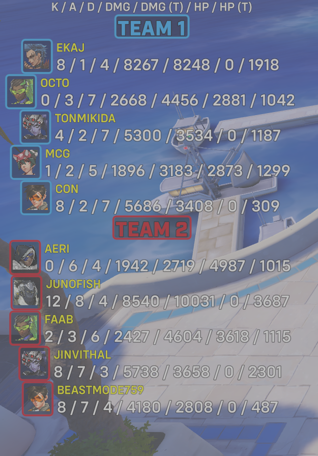 | Team | Player | Kills | Assists | Deaths | Damage | Damage (Taken) | Healing | Healing (Taken) |
