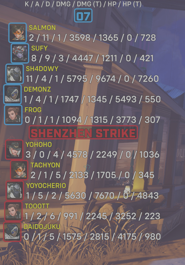 10 entries| Team | Player | Kills | Assists | Deaths | Damage | Damage (Taken) | Healing | Healing (Taken) |