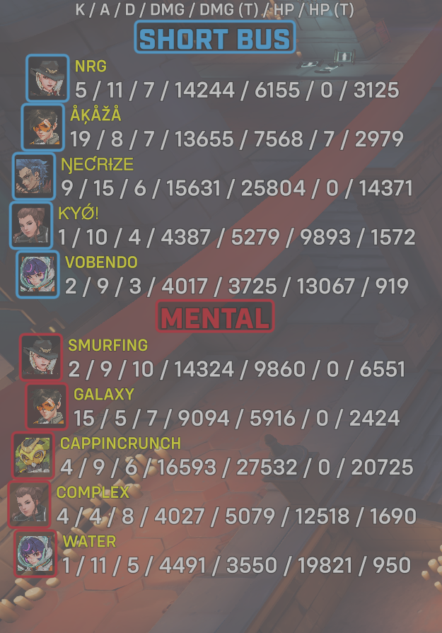 10 entries| Team | Player | Kills | Assists | Deaths | Damage | Damage (Taken) | Healing | Healing (Taken) |