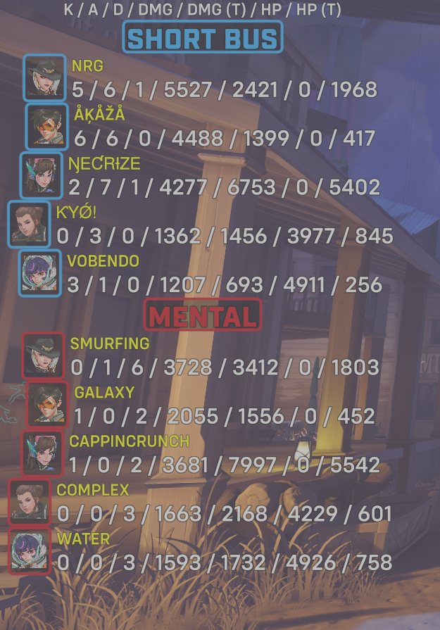 10 entries| Team | Player | Kills | Assists | Deaths | Damage | Damage (Taken) | Healing | Healing (Taken) |
