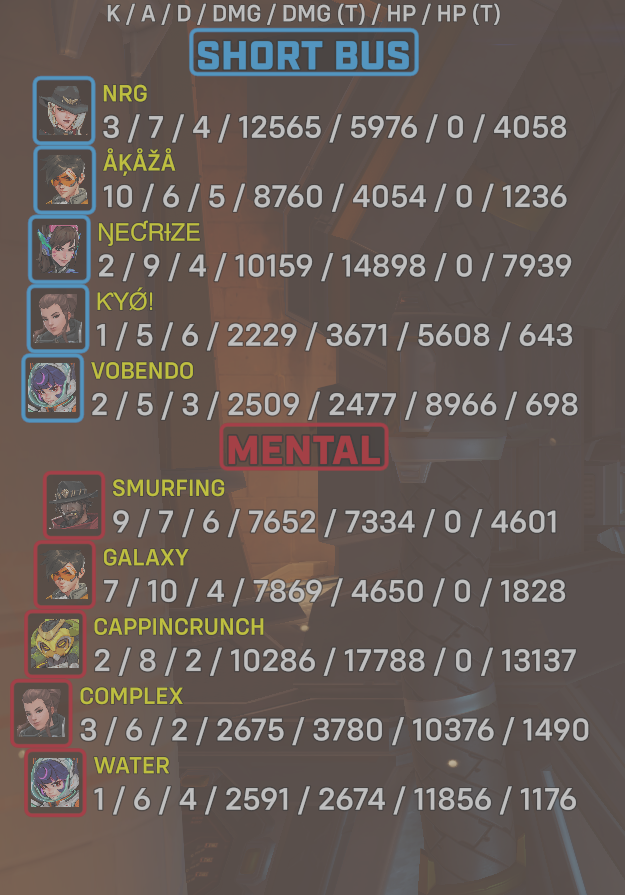 10 entries| Team | Player | Kills | Assists | Deaths | Damage | Damage (Taken) | Healing | Healing (Taken) |