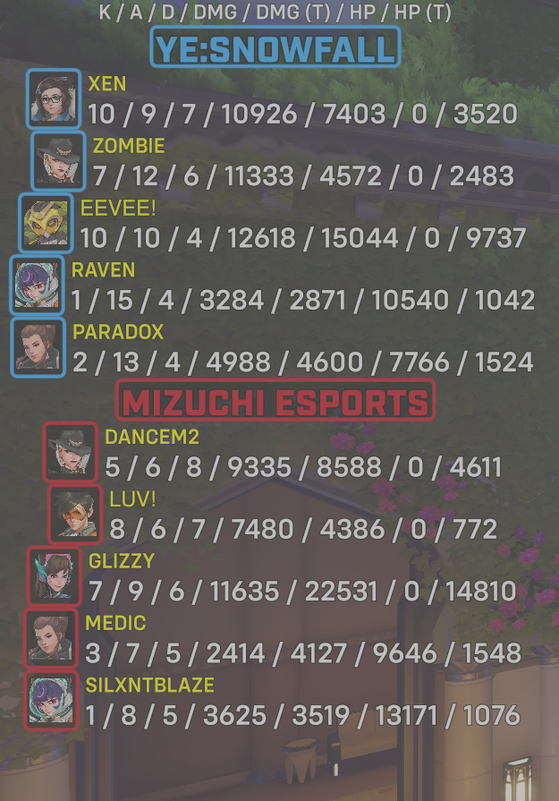 10 entries| Team | Player | Kills | Assists | Deaths | Damage | Damage (Taken) | Healing | Healing (Taken) |