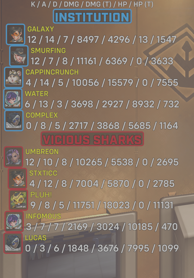 10 entries| Team | Player | Kills | Assists | Deaths | Damage | Damage (Taken) | Healing | Healing (Taken) |