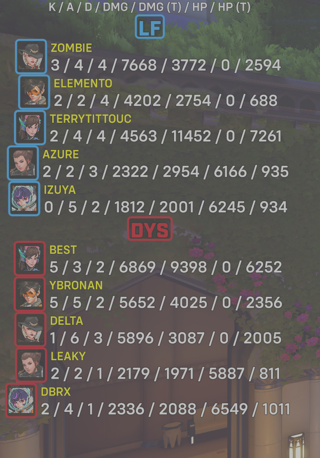 10 entries| Team | Player | Kills | Assists | Deaths | Damage | Damage (Taken) | Healing | Healing (Taken) |