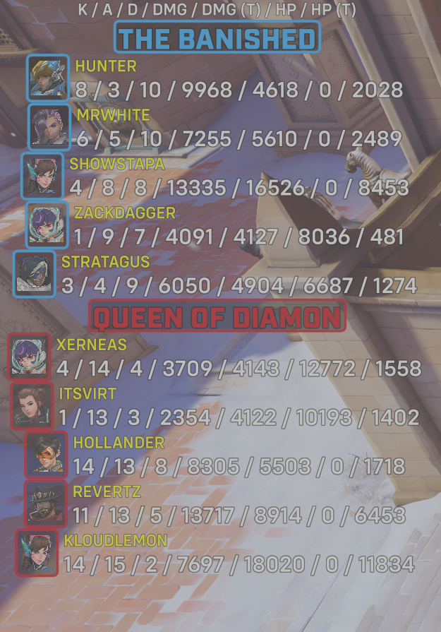 10 entries| Team | Player | Kills | Assists | Deaths | Damage | Damage (Taken) | Healing | Healing (Taken) |