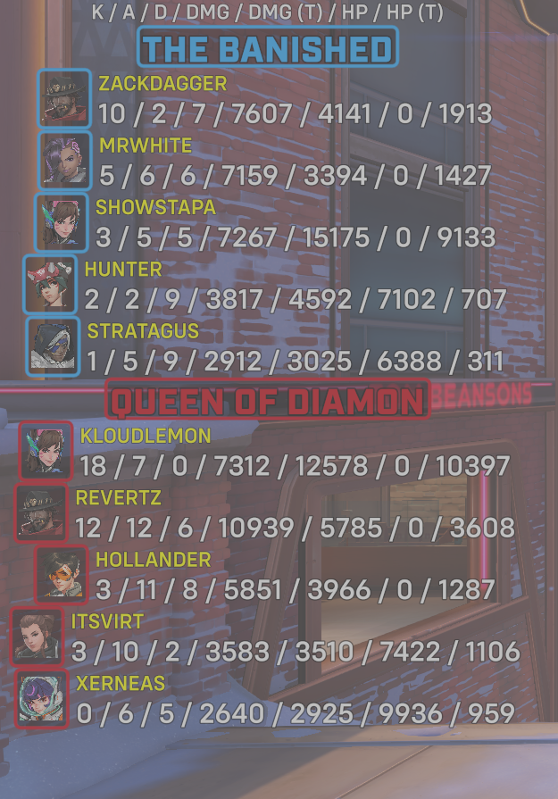 10 entries| Team | Player | Kills | Assists | Deaths | Damage | Damage (Taken) | Healing | Healing (Taken) |