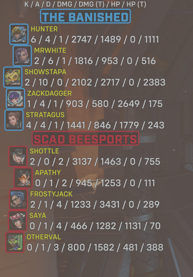 10 entries| Team | Player | Kills | Assists | Deaths | Damage | Damage (Taken) | Healing | Healing (Taken) |