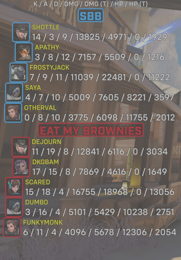 10 entries| Team | Player | Kills | Assists | Deaths | Damage | Damage (Taken) | Healing | Healing (Taken) |