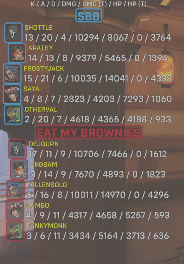10 entries| Team | Player | Kills | Assists | Deaths | Damage | Damage (Taken) | Healing | Healing (Taken) |