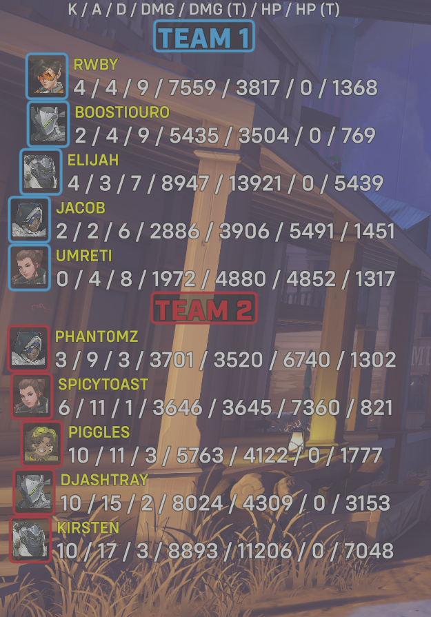 10 entries| Team | Player | Kills | Assists | Deaths | Damage | Damage (Taken) | Healing | Healing (Taken) |